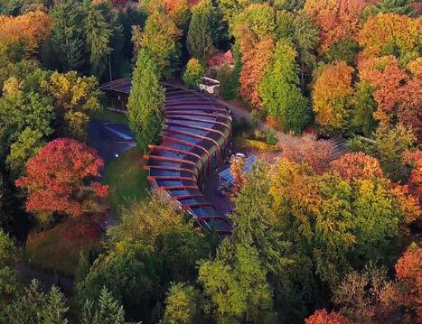 het duurzame karakter van de locatie duidelijk voelbaar is. De vloerbedekking is bijvoorbeeld gemaakt van gerecyclede autobanden en jeans.” Tijdens een zakelijk evenement worden de gasten ook helemaal ondergedompeld in de natuur. ”Om het Apenheul-gevoel hier nog eens te benadrukken, is het mogelijk spectaculair te openen met het kenmerkende gezang van de gibbon. Aandacht gegarandeerd! Elke zaal is ook nog eens voorzien van een prachtige muurschildering van een apensoort, gemaakt door één van de gepassioneerde medewerkers van Apenheul. En het natuurgevoel dat je buiten het gebouw meekrijgt in Stadspark Berg & Bos, is ook doorgetrokken in de materiaalkeuze en kleuren van het interieur.”