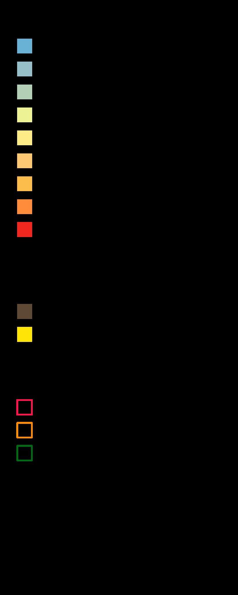Por ultimo como tercera referencia, se encuentran marcados en color marrón, las áreas correspondientes a los barrios populares, mientras que, en color amarillo se representan los barrios privados, countries y estancias.