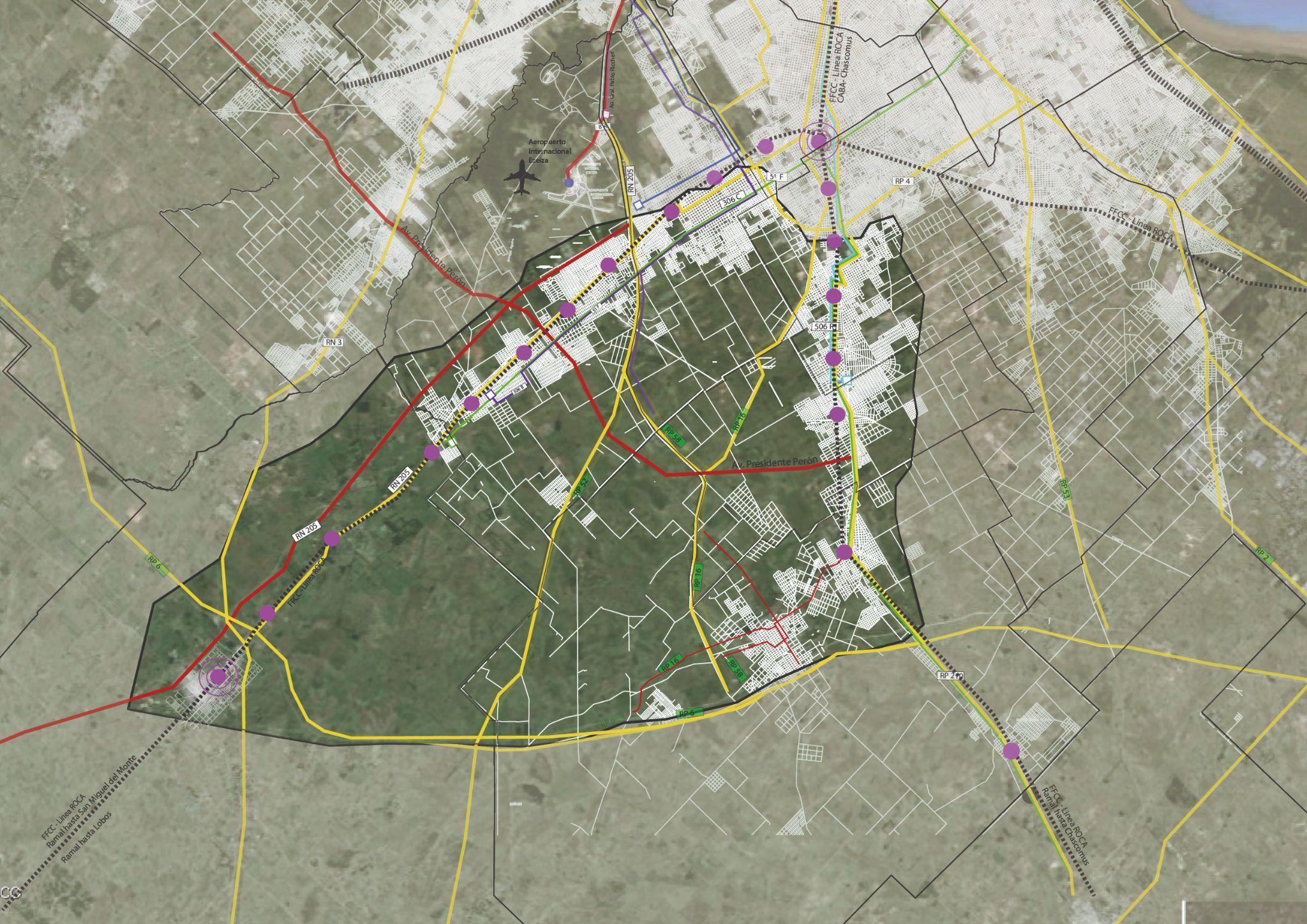 Al observar el mapa del área de diagnóstico, podemos identificar claramentelasestacionesdetrenLINEA ROCA,lasautopistas,lasrutasnacionales y provinciales que estructuran esta región.Esta zona de estudio,con una superficie aproximada de 830 km², se encuentra a unos 17 km de la Ciudad AutónomadeBuenosAires(CABA). provinciales(RP58,RP52,RP16,RP210)y la ruta nacional RN205, que complementan la red ferroviaria. Estas rutassonvitalesparaeltransportediario Transaccionesdesube08-12am