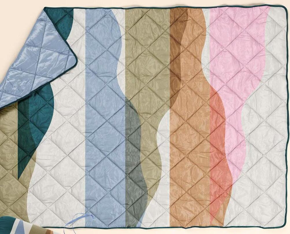 You know your favorite puffy jacket that’s oh-so-warm, yet weighs almost nothing? That essential piece that you couldn’t imagine life without? Well, imagine that as a full-color blanket! Our puffy quilted blanket works great indoors or out, and it conveniently packs down into its included matching drawstring bag. The sustainably-produced 30D nylon material is lightweight, washable, and it sheds beach sand or baguette crumbs with a simple shake. It’s definitely a staple piece for the beach or that special spot under the big tree at the park.