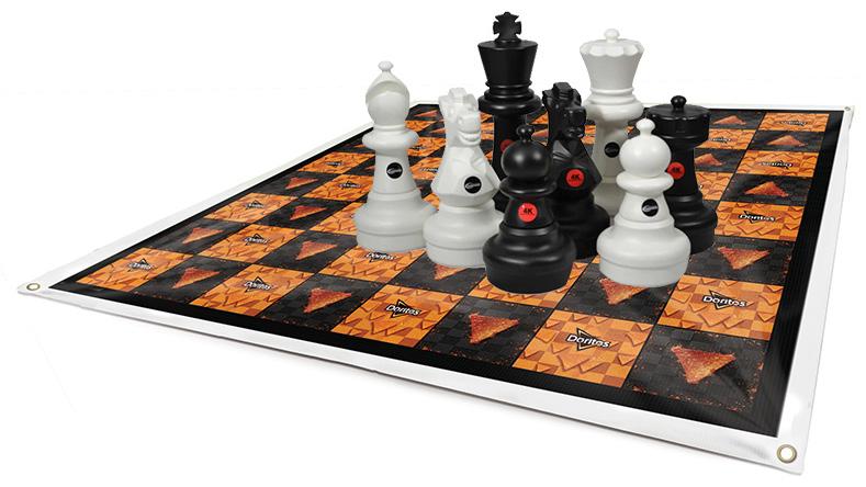 A showstopping 4 ft by 4 ft branded chess game with giant vinyl pieces and a custom-printed mat—perfect for events and crowd interaction.