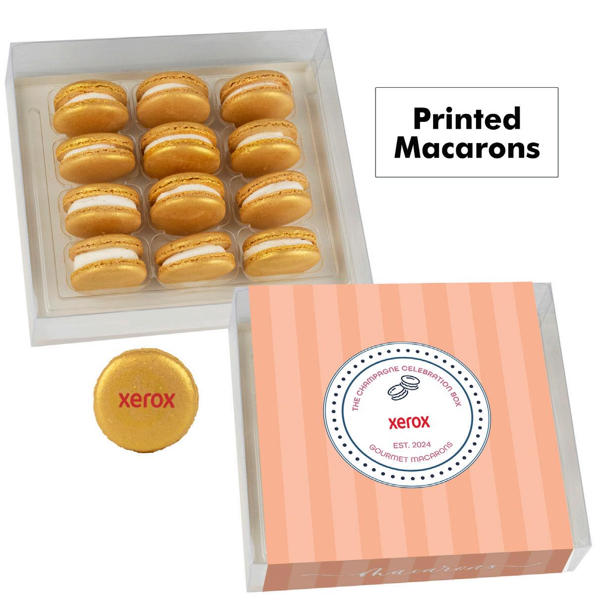 Savor the sweetness of French tradition in every bite with our handcrafted macarons, made with only the finest ingredients. Each delicate shell, crispy on the outside and melt-in-your-mouth soft on the inside, is filled with rich, flavorful ganache, creating a perfect balance of sweetness and sophistication. This set of 12 macarons is ideal for sharing, making every moment a little sweeter and more memorable. Each gift box features a metallic gold trim base and is decorated with a fully custom, 4 color process sleeve.