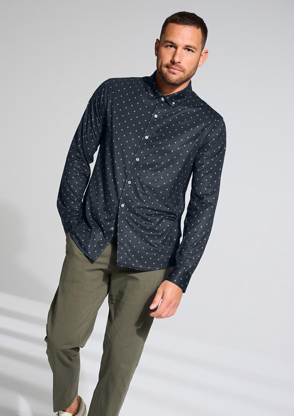 All the traditional components of a classic dress shirt combined with the comfortable drape of soft jersey fabric in a modern, moisture-wicking hybrid silhou ette. A versatile choice for the office featuring all the comfort of a favorite tee.