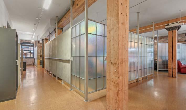 Glass partitioned walls create a feeling of airiness and allow for natural light to filter throughout the space