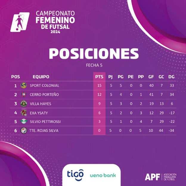 En la categoría femenina, este año 2024 denominado Campeonato Femenino de Futsal, el título se lo llevó Sport Colonial, que sumó su sexto campeonato Absoluto y obtuvo así la clasi昀椀cación a la CONMEBOL Libertadores de Futsal Femenina 2025 como representante paraguayo.