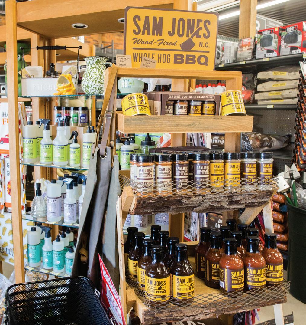 In addition to chicken feed and farm supplies, the store also boasts a selection of goods for people who might just be passing through. Boiled peanuts and a variety of barbecue seasonings and supplies, because Que Marks