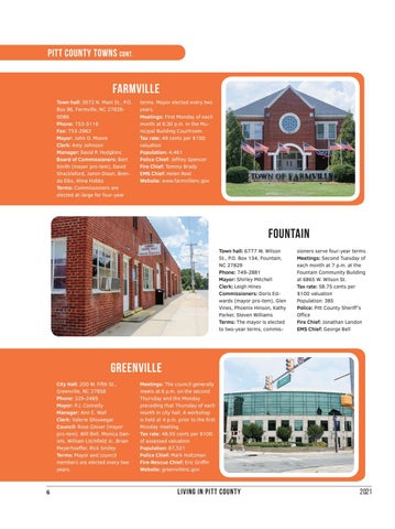 sioners serve four-year terms. Meetings: Second Tuesday of each month at 7 p.m. at the Fountain Community Building at 6865 W. Wilson St. Tax rate: 58.75 cents per $100 valuation Population: 385 Police: Pitt County Sheriff’s Office Fire Chief: Jonathan Landon EMS Chief: George Bell