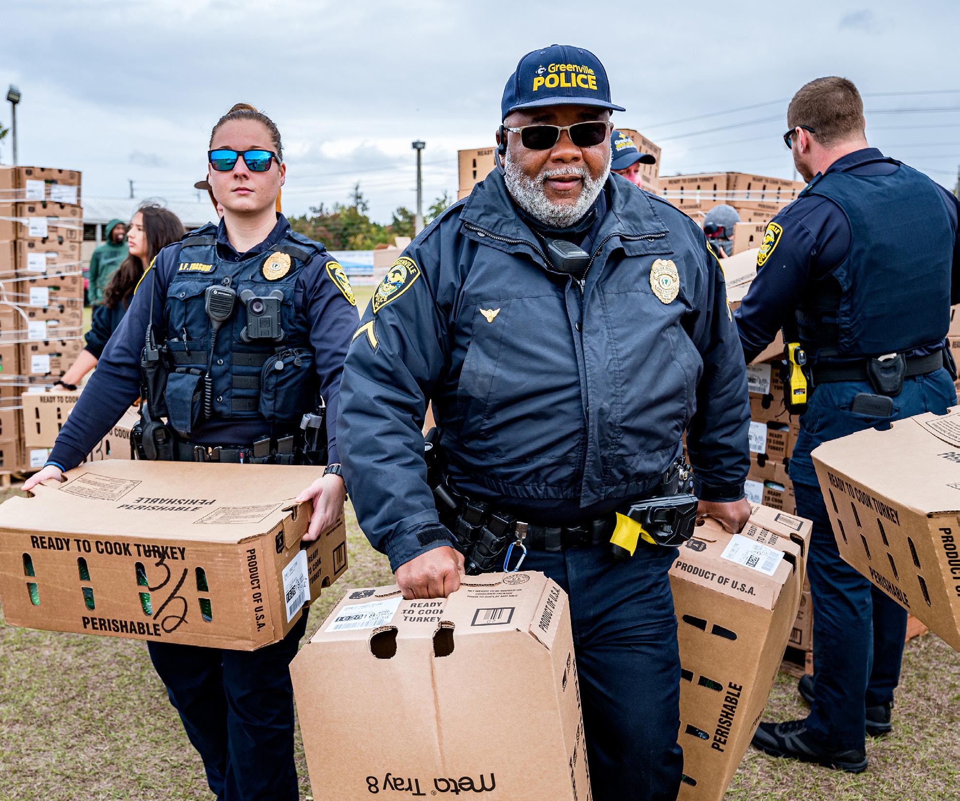 The Greenville Police Department and its officers work with barbers and business owners, faith groups and community organization to provide food, clothing and toys to people in need through the holiday season and other times during the year.