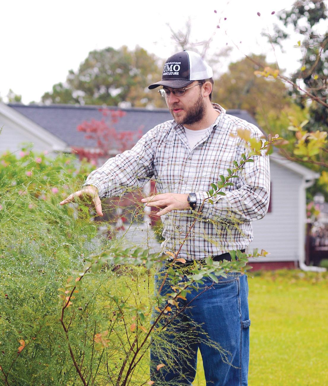 It’s not like the Ange house — the museum — was new to Jonathan Riggs. His father, Jesse, had been bringing him out there since he was a small child. Jesse shares a photograph of Jonathan posing with a Cox Cotton Planter patented by his great-great-great-grandfather, John Cannon Cox. e cotton planter is on display at the museum. So perhaps it’s appropriate to say the museum’s land scaping needs represented low hanging fruit for the agriscience teacher.