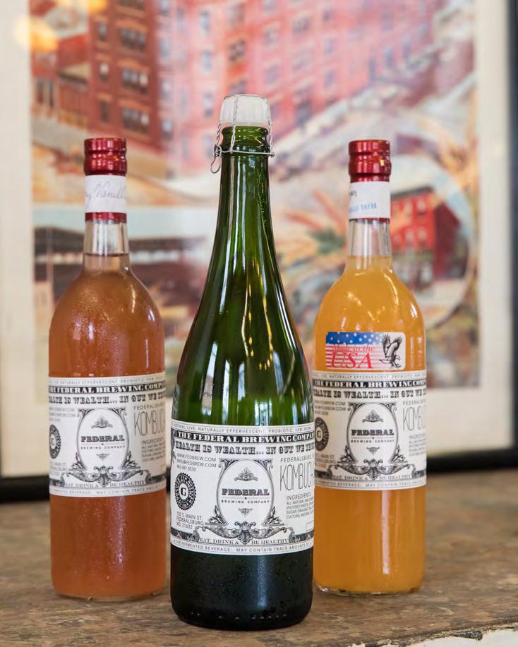 alcohol content of its kombucha to ensure that it remains below the legal limit of 0.5 percent. For those who choose to drink alcohol, kombucha can be used as an alternative to a standard cocktail mixer. Galbraith said many people report that kombucha prevents hangovers. Federal Brewery’s kombucha is a live, raw food that is gluten-free, vegan, low calorie, and low sugar, with no artificial flavors or colors. She recommends drinking four to six ounces a day at first to receive kombucha’s therapeutic benefits.