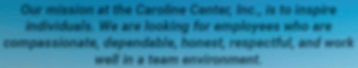 Our mission at the Caroline Center,Inc., is to inspire individuals.Weare looking for employees who are compassionate, dependable,honest, respectful, and work well in ateam environment.