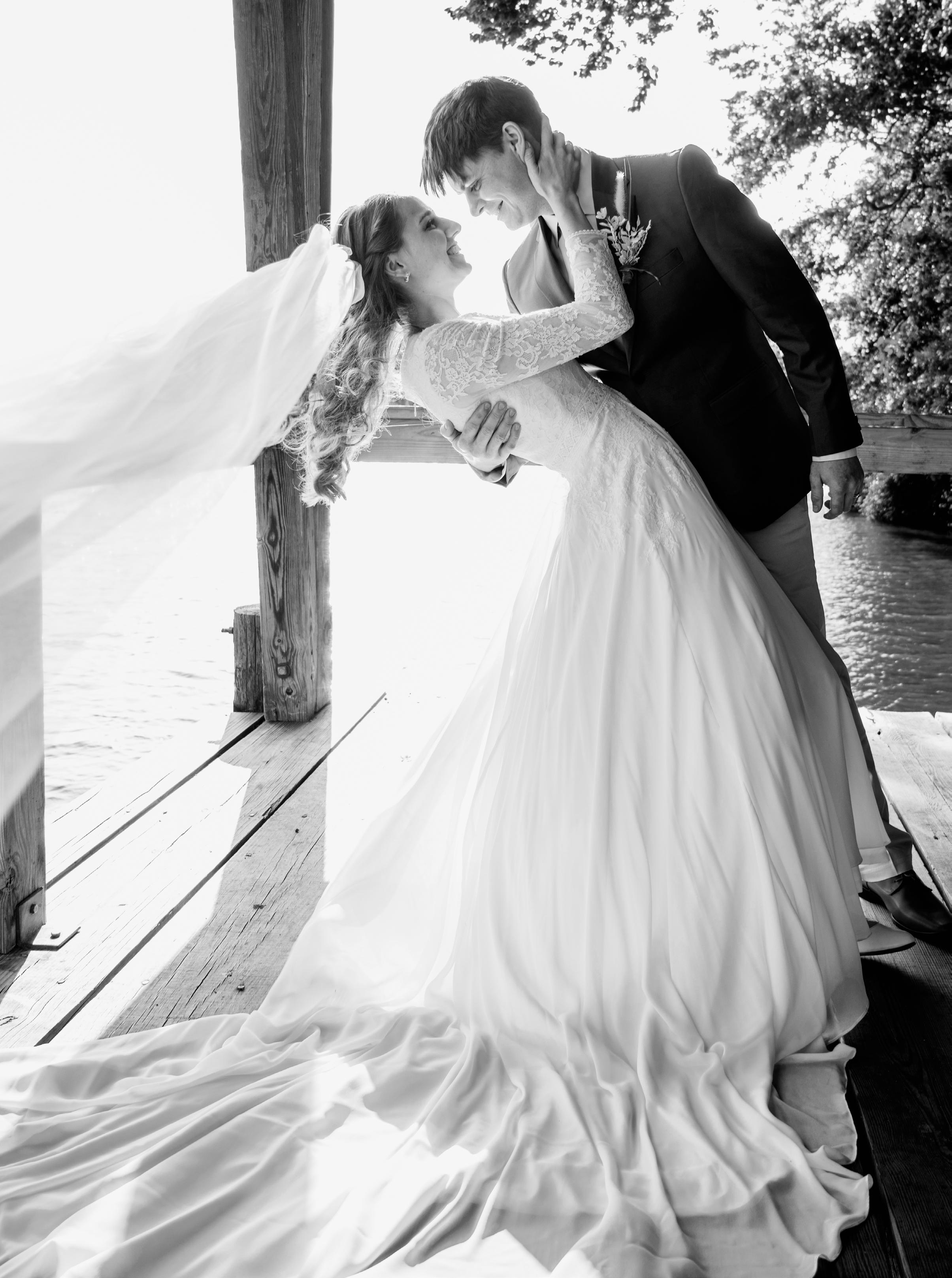 During the ceremony, the couple embraced the beauty of the surrounding nature. The dock was the perfect backdrop, even if they had a few unexpected kayakers as wedding crashers. They wrote their own vows with mentions of fishing, dogs and many pizza nights, getting chuckles out of each other and the guests.