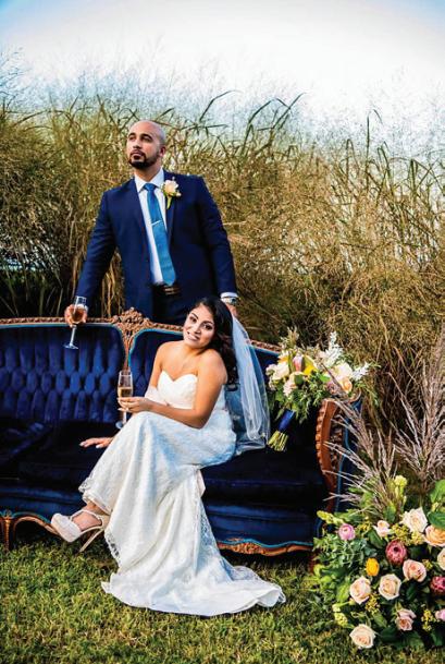 Photographer Audrey Wozny and creative director Jennifer Quinn definitely took advantage of the resort’s scenic locale for the shoot. Josh and Julie made a striking couple, with Julie styled to perfection by KC Artistry’s hairstylist Biki Rodriguez and makeup artist Ali Duca. Sarah McGuinn of Champagne Taste Bridal Boutique outfitted the couple in timeless styles.