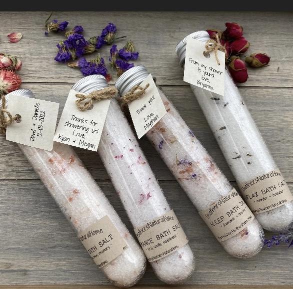 She offers personalization on most of her products, by way of labeling, tags or notes. Most people will want a simple combination of their names and their union dates and Heather tries to fulfill creative requests as best she can. Each of her products is made to easily personalize. On her bath salts, there is a tag that wraps around the container for personalization.