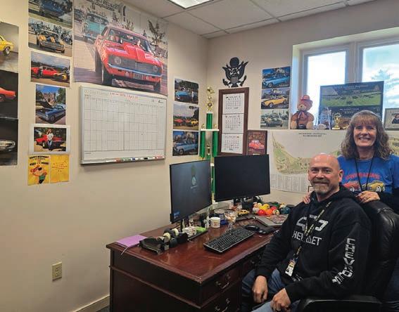Anthony “Tony” and Lisa Taylor pose for a photo surrounded by memorabilia from their travels with their classic Chevrolet cars April 4 in Tony’s office at the Department of Public Works Environmental Management Division.