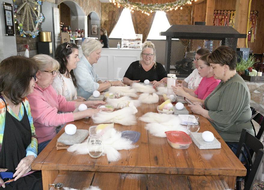 Her Wool & Wine series allows crafters to sip wine or a non-alcoholic juice while they work. DavisPerez frequently hosts workshops at Broken Spoke Winery in Earleville and Dove Valley Vineyard in Rising Sun. Ahead of the Easter holiday, felters gathered around the table at Broken Spoke to make
