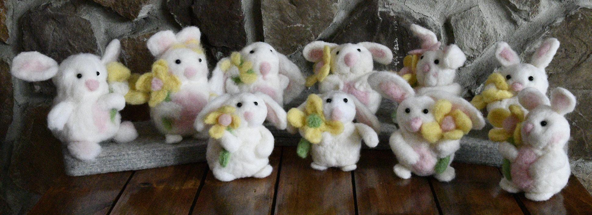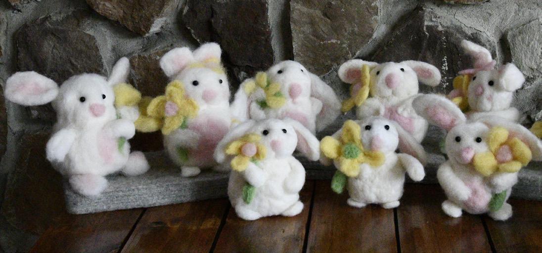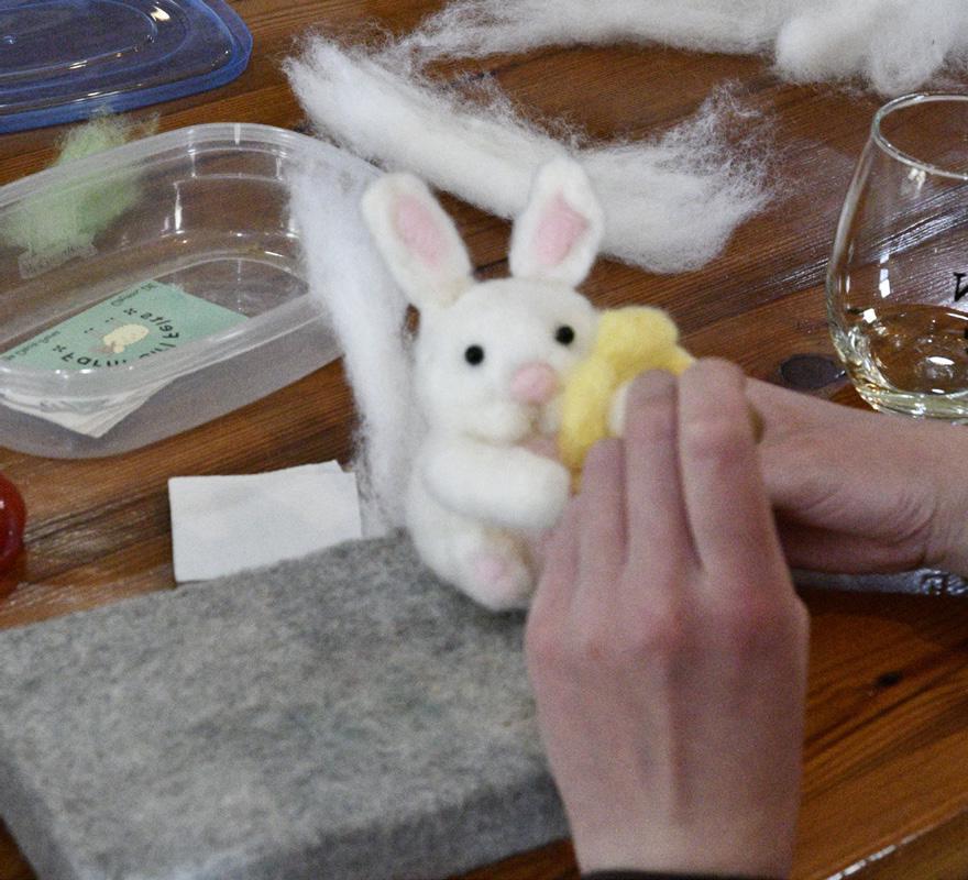 Top: Attendee felting her bunny and enjoying a glass of wine.