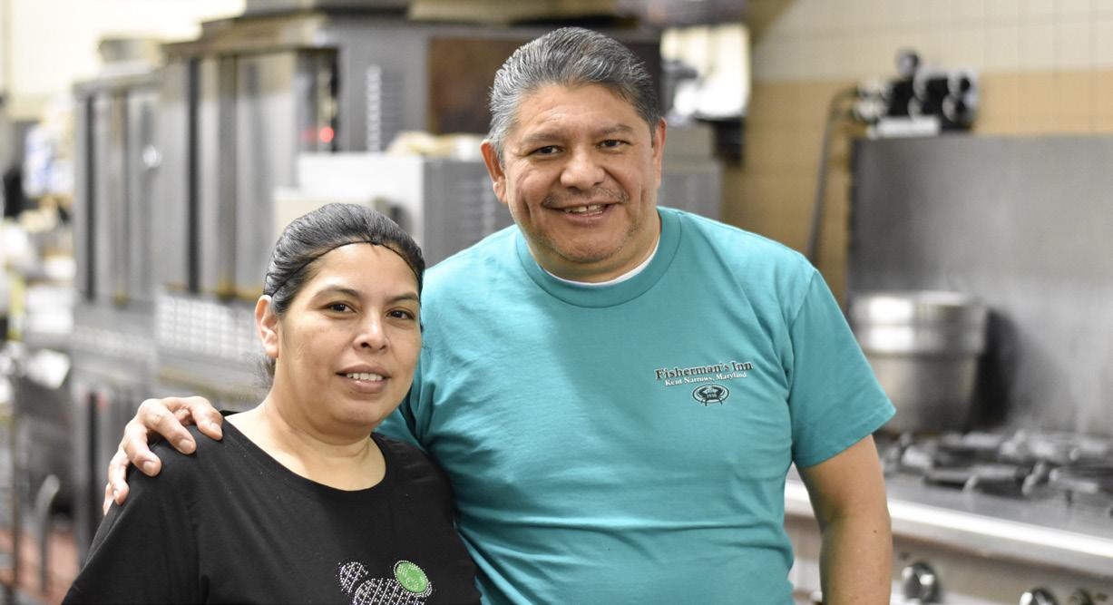 Left: Chef team at Fisherman’s Inn. Right: Juan Chaves and Juanita Garcia.