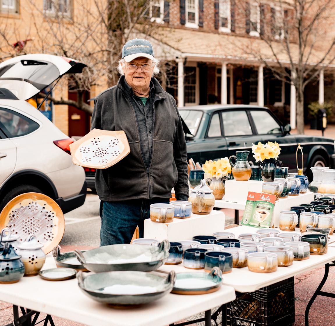 Potter Doug Sassi agrees. Standing behind a display of his exquisite stoneware creations that entice visitors to stop and look, he commented that many people at the farmers market came from Lancaster, Pennsylvania, and Wilmington, Delaware, during the pandemic.