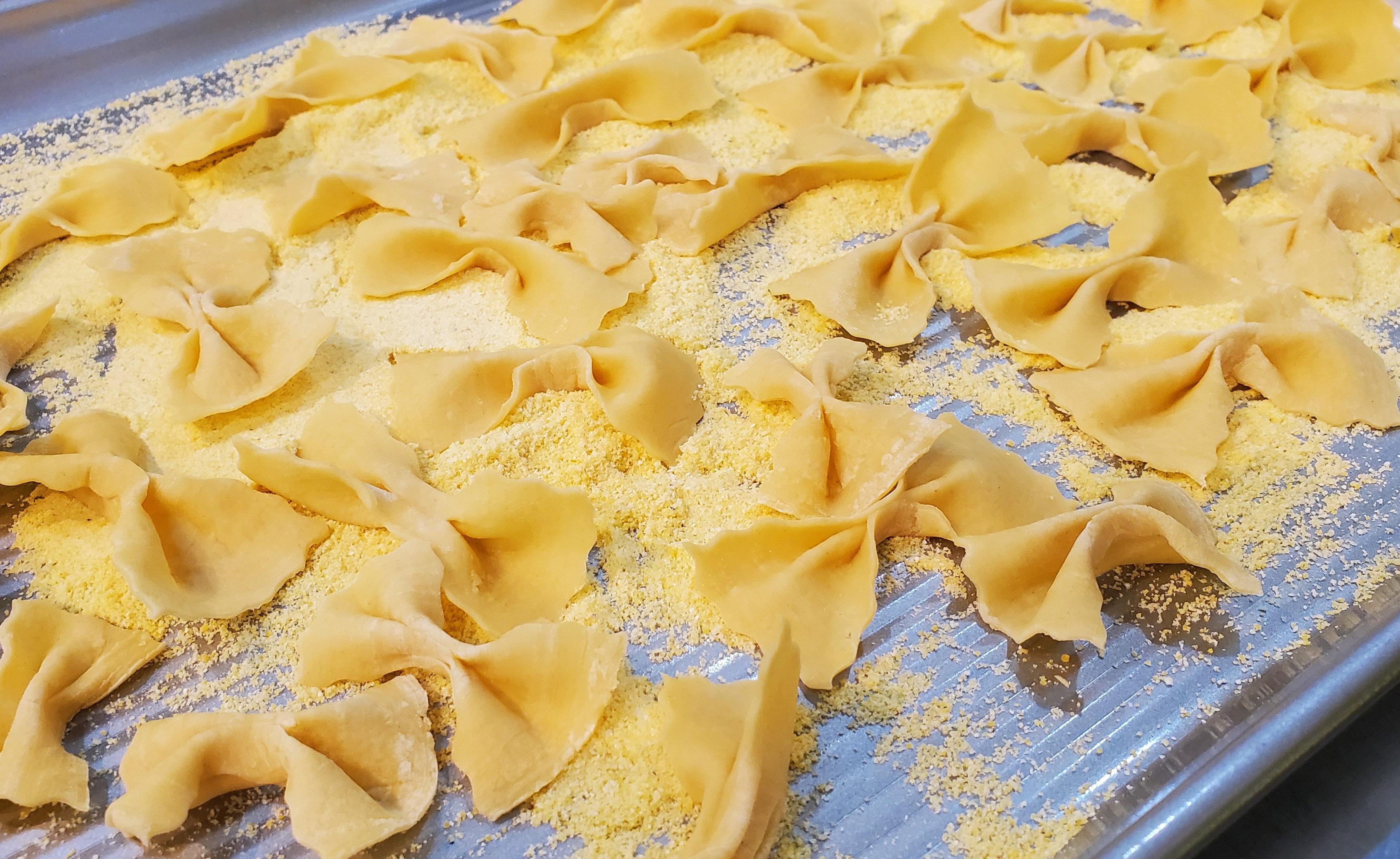 dough: after rolling it flat, we folded it back on itself and rolled it again, strengthening the gluten in the dough. This creates a better, more toothsome texture.