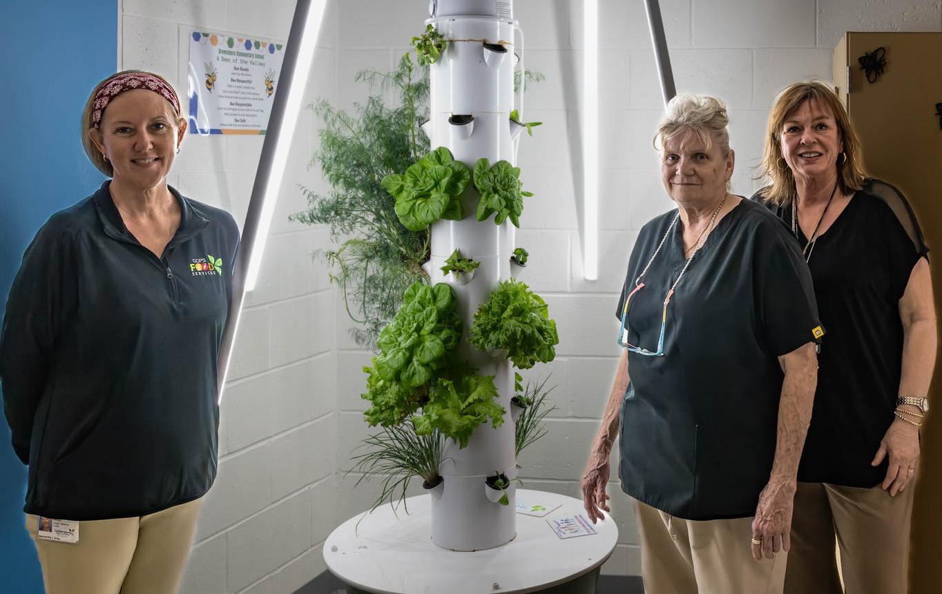 Bottom right: Pictured left to right are Samantha King, Food Services Coordinator for CCPS; Faye Harris, Cafeteria Manager for Greensboro Elementary School; and Beth Brewster, Supervisor, CCPS with the school’s hydroponic garden towers, providing lettuces, basil, chives, dill, mint, and cilantro from seedlings from local farmers for the school lunch lines.