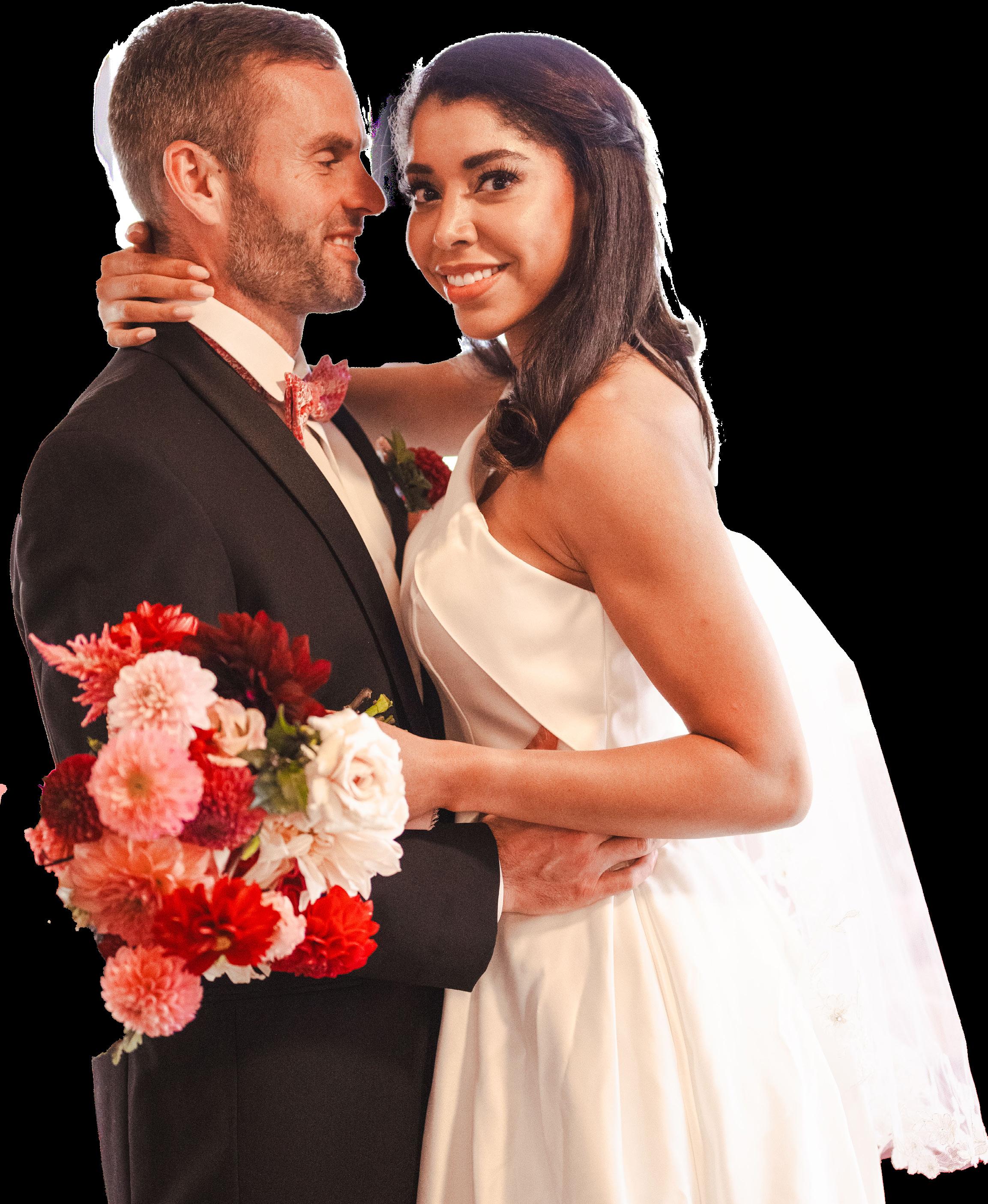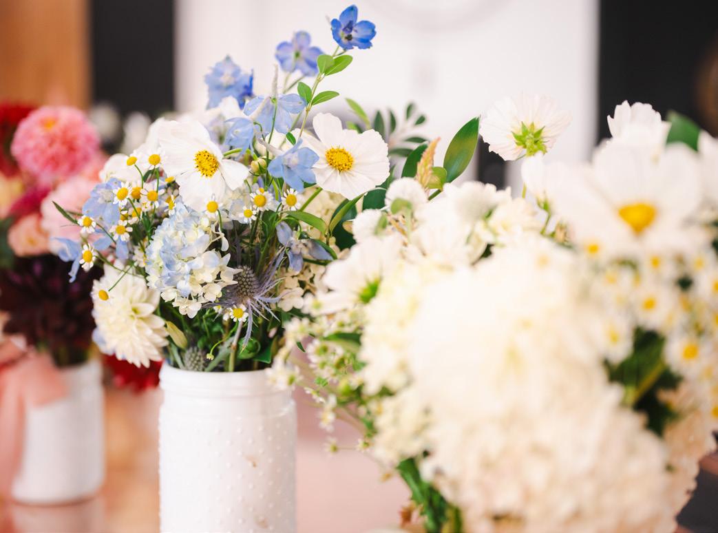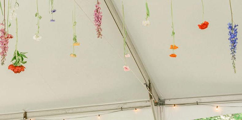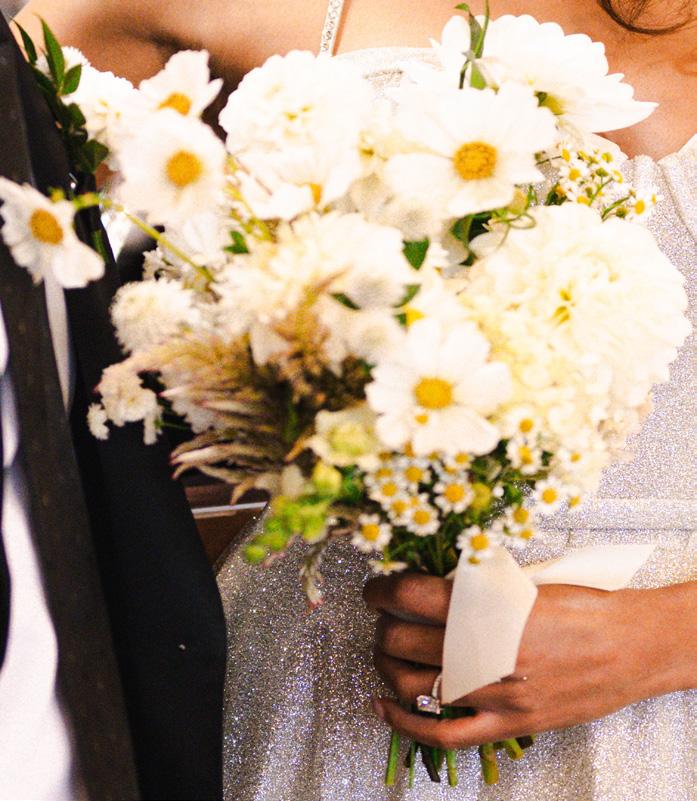 Tresselt used fishing line to hang individual stems from the ceiling in the place of string lights, created vibrant bouquets and decorative table arrangements, and a hair piece for Dade. She remembers Tresselt gifting her some flowers during their planning meetings and throwing in