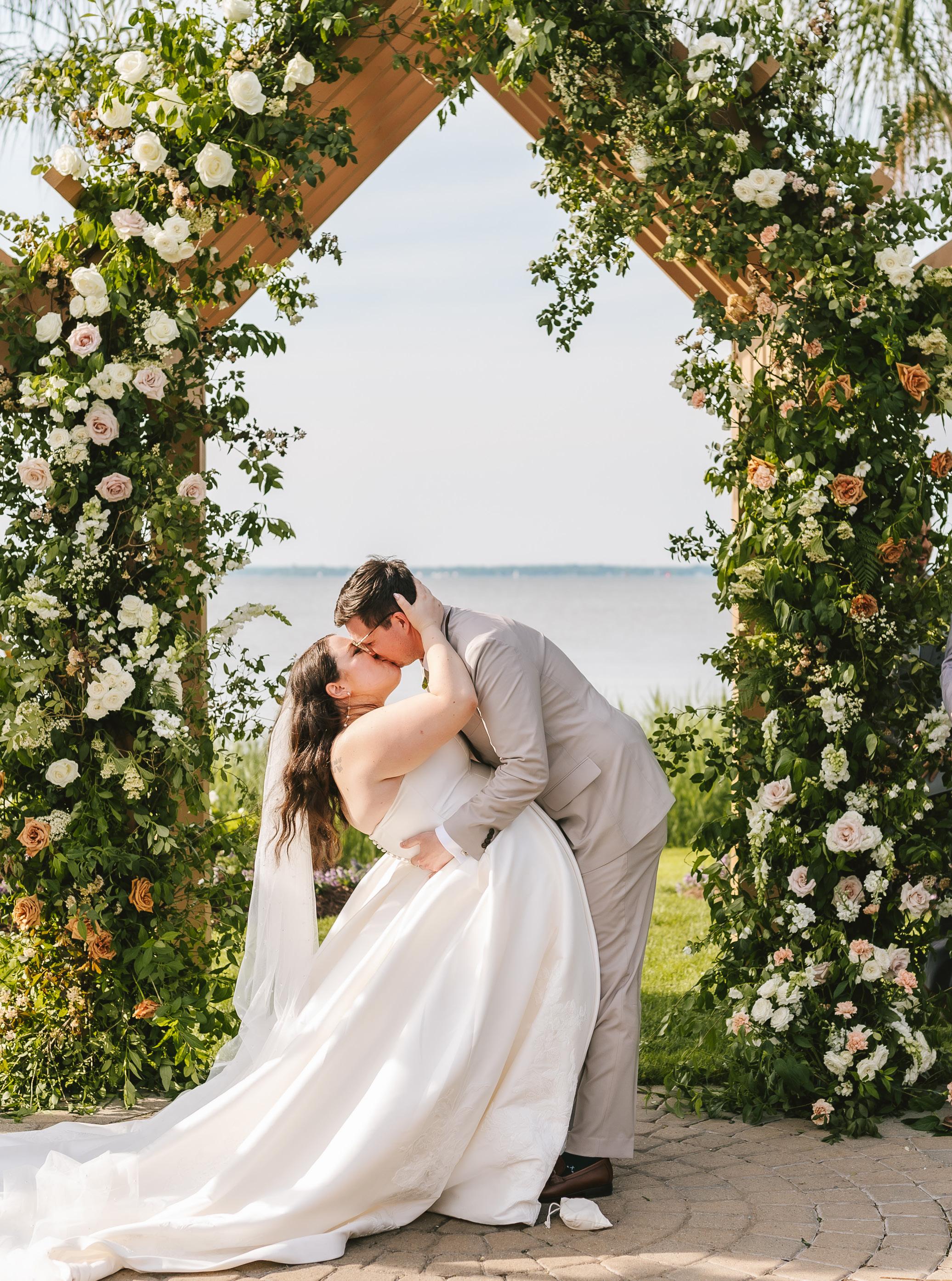 Excitement was in the air as engaged couple Kennedy Taylor and William Tibbetts sat in the dressing room at the Pavilion at Weatherly, a waterfront wedding venue in Newburg, Maryland. As they patiently waited for makeup artist Lina Walker to finish Taylor’s look, from the balcony they could see flower farmer Brittany Doyle arranging blue hydrangeas on an archway with the Potomac River flowing gently behind her.