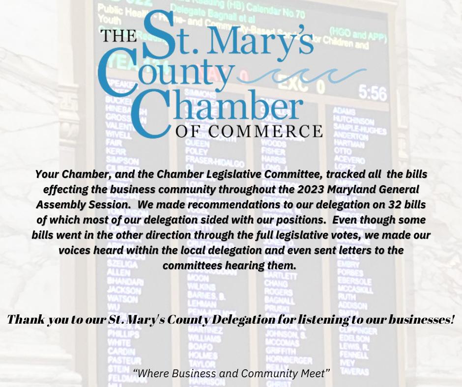 Your Chamber also advocates for the business community through a variety of activities. Our Government Affairs Committee reviews proposed legislation during the annual General Assembly of Maryland. We hold a Legislative gathering each spring after the session. At this gathering, the Senator and Delegates representing St. Mary’s County provide updates on the issues they have dealt with in Annapolis and what may be forthcoming. We also sponsor an annual State of the County Luncheon, where St. Mary’s County Commissioners update the business community on the activities of county government and answer questions from the audience. We sponsor a similar event for the St. Mary’s County Public Schools, the State of the Schools Luncheon, where the Superintendent and his staff brief the business community on the school system.