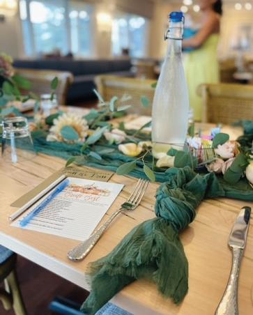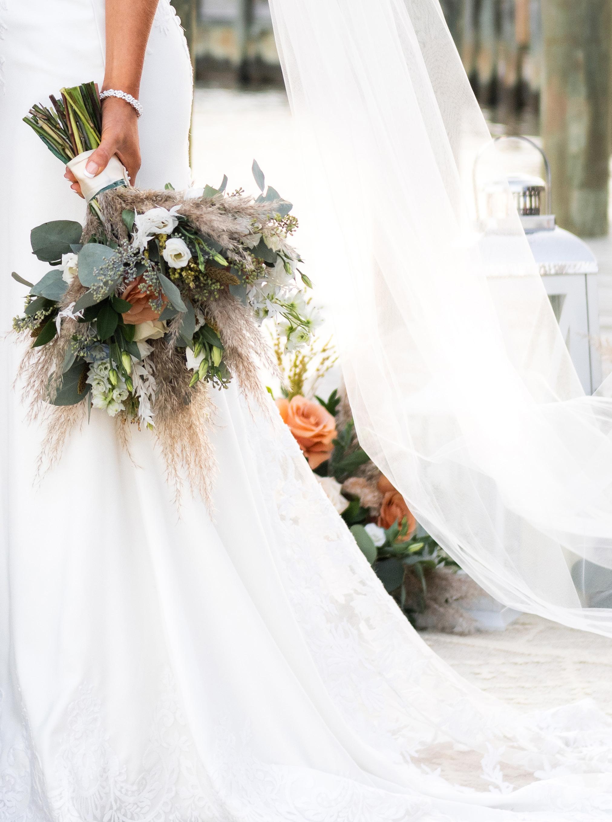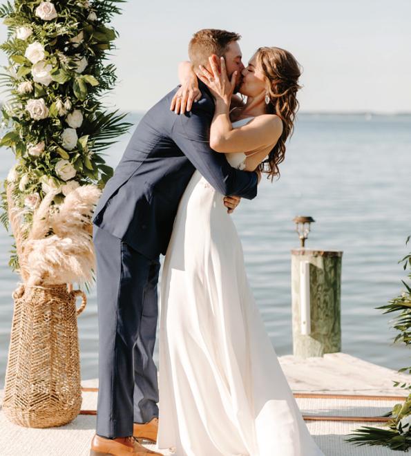 The couple highlighted three trends popular in bridal today, provided by Pretty Little Wedding Company. The beauty of natural neutrals drew pops of blue from the waters around the Dock House with fun florals full of texture. In a dress sleek but with flow and movement, white flowers with pops of blue and dotted with greenery from Bloomin’ Wild rounded out the look.
