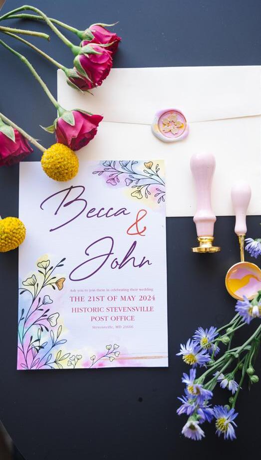 At the historic Stevensville Post Office, elevated whimsy was on full display with bright pops of playful color. Large format textures and untamed florals lent abstract shapes and high drama to the Alice-in-Wonderland look.