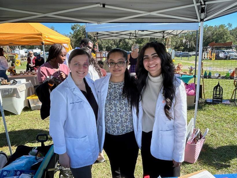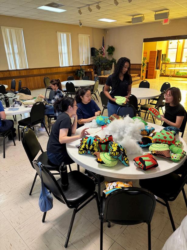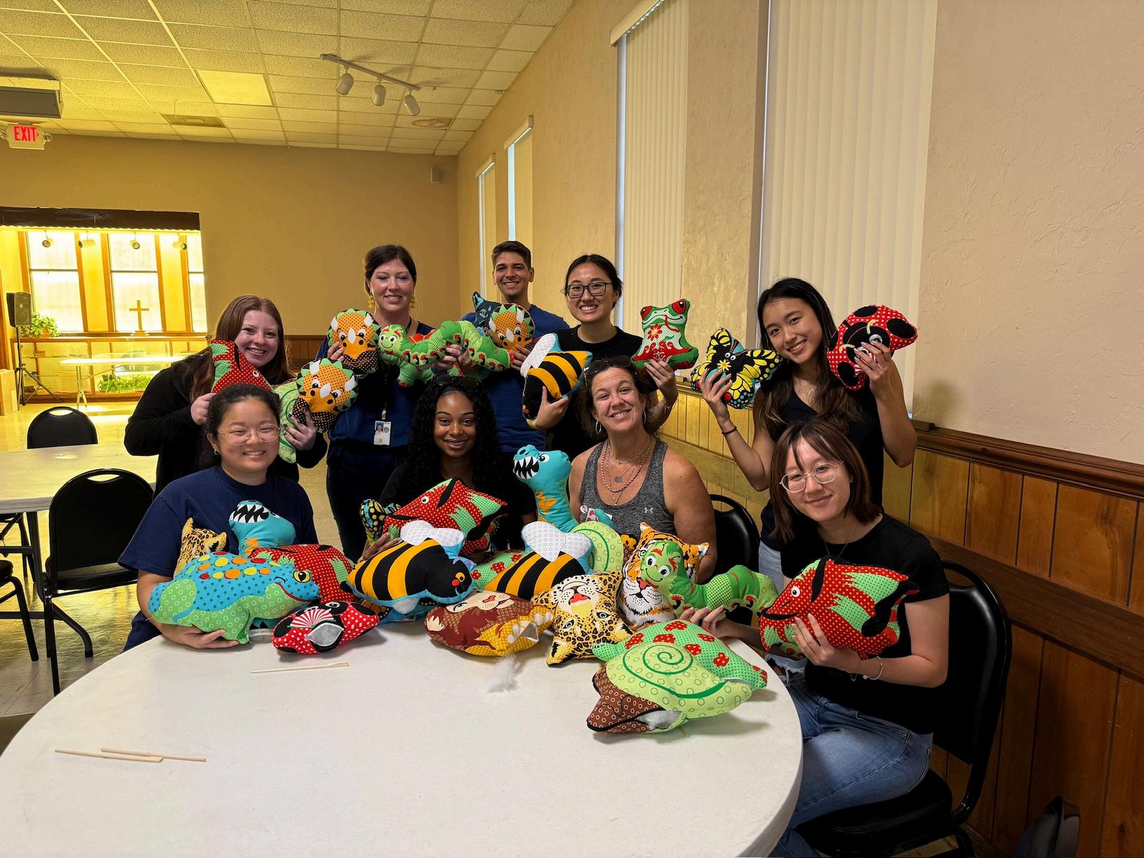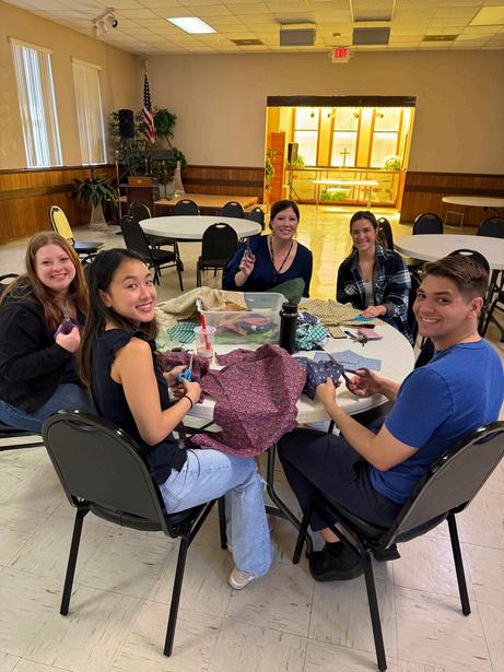 On November 2nd, pharmacy students volunteered at the North Florida Sewing Center, held at Wesley Methodist Church in the Methodist Hall. The center’s mission is to foster a safe and collaborative environment where needlework is used to promote health and sustainability. During the event, students engaged in tasks such as cutting fabric, pinning patterns, and organizing craft items that were prepared for donation to women ’ s shelters, homeless facilities, and animal organizations. Their efforts contributed to creating reusable pads, blankets, bags, hats, and pet beds, all aimed at supporting individuals and animals in the community who are experiencing homelessness.