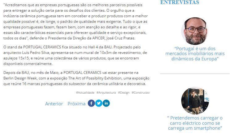 Revista O Instalador Online https://www.oinstalador.com/Artigos/472544-Portugal-Ceramics-na-BAU-comstand-e-conferencia-Portugal-Ceramics-Buildings-Today.html