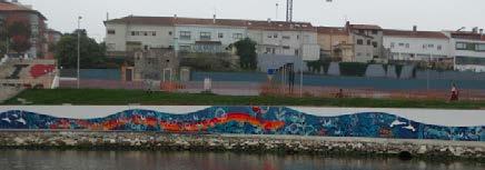 Next to the Antiga Fábrica Jerónimo Pereira Campos, there is a new panel of tiles measuring 57 x 3 m, consisting of 5616 hand-painted tiles that took over 3 months to paint, by hand, at Aleluia Cerâmicas. The panel was designed by the artist from Aveiro, Fatinha Ramos, a former student of the Visual Arts Course at José Estêvão Secondary School. The artist worked for a few years as a designer, but ended up realizing her longlasting dream and becoming exclusively an illustrator. As an illustrator, she creates imaginary and surreal realities. Her work features unique textures and a very bright color palette. Her illustrations can be found both in children’s books, murals, animation cinema, theater/scenography, fashion, and in this case also in ceramics.