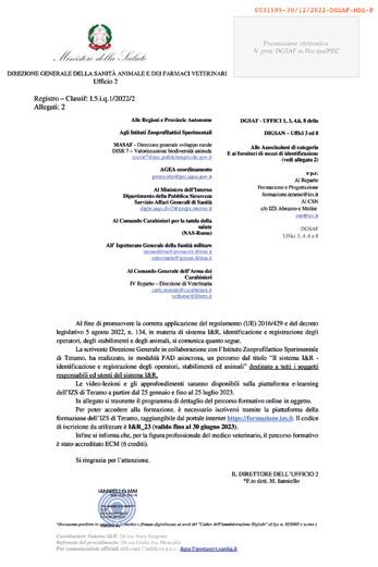 ultima circolare del Ministero della Salute (Protocollo n. 0031599 del 30.12.2022, a firma della Direzione Generale della Sanità animale) parla chiaro: la corretta applicazione del regolamento (UE) 2016/429 e del decreto legislativo 5 agosto 2022, n. 134, in materia di Sistema I&R, richiede un percorso formativo specifico per l’identificazione e la registrazione di operatori, stabilimenti ed animali. È un impegno che, alla luce della nuova normativa europea e nazionale, riguarda tutti coloro che allevano animali e indipendentemente dall’indirizzo produttivo (allevamento familiare o commerciale).
