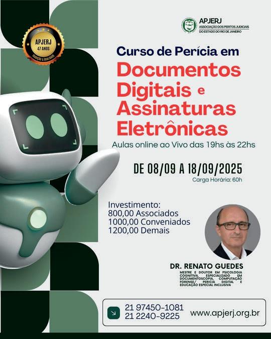A APJERJ celebra o lançamento de duas obras de grande relevância técnica por seus associados Os peritos André Luis Pinheiro, Diretor de Perícias Grafotécnicas da APJERJ, e Mario Ernesto de Oliveira publicaram A Importância do Laudo Grafotécnico dentro da Sentença Monocrática pela Juruá Editora A obra traz uma abordagem teórica e prática sobre o papel dos laudos grafotécnicos na fundamentação de decisões judiciais