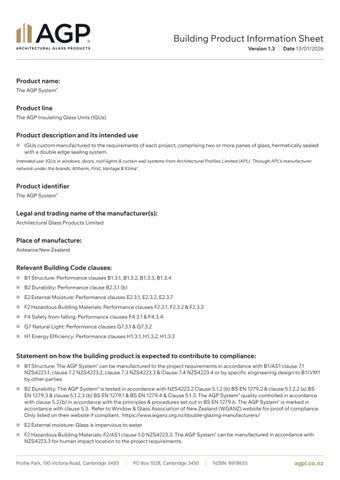 B2 Durability: The AGP System® is tested in accordance with NZS4223.2 Clause 5.1.2 (b) BS EN 1279.2 & clause 5.1.2.2 (a) BS EN 1279.3 & clause 5.1.2.3 (b) BS EN 1279.1 & BS EN 1279.4 & Clause 5.1.3. The AGP System® quality controlled in accordance with clause 5.2 (b) in accordance with the principles & procedures set out in BS EN 1279.6. The AGP System® is marked in accordance with clause 5.3. Refer to Window & Glass Association of New Zealand (WGANZ) website for proof of compliance. Only listed on their website if compliant. https://www.wganz.org.nz/double-glazing-manufacturers/