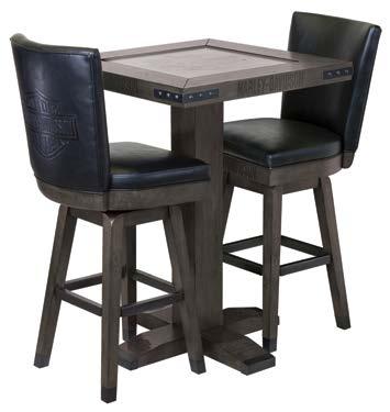 Round black folding table featuring light grey Harley-Davidson and Open Bar & Shield graphic. Four mesh cup holders and lower shelf for extra storage 21” x 21“/ 53 x 53 cm. Powder coated steel tube frame and 600 Denier polyester fabric. Folds for easy storage and transport in convenient carry bag.