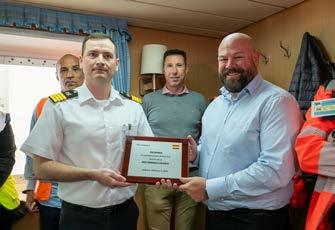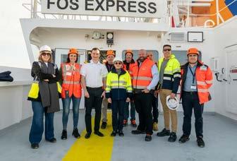 En la foto del la página 12, el atraque del Fos Express en el muelle de Levante de APM Terminals Valencia. Sobre estas líneas, el buque en APM Terminals Barcelona, en operaciones en Valencia y varias imágenes de la entrega de las metopas al capitán . Terminals Spanish Gateways, y la presidenta de la Autoridad Portuaria de Valencia (APV), Mar Chao, entregaron sendas metopas al capitán del buque, en un acto al que también acudieron Cristina Rodríguez, jefa de Comercial y Clientes de la APV, José María Picazo, Iberia & France head of Sales de Maersk, Enrique Martí, Terminal Performance & Berth Planning Manager de Hapag-Lloyd, Daniel Muñoz, Operations Manager de APM Terminals Valencia, y Alberto González, Terminal Supervisor. Como sabéis, la ambición de la