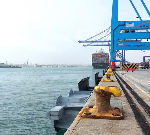 El muelle de Levante de APM Terminals Valencia, además de las dos nuevas grúas STS, está siendo objeto de varios proyectos de cara a mejorar sustancialmente las capacidades técnicas y operativas en la terminal, y ser capaces de prestar servicio a los buques portacontenedores de mayores dimensiones. En cuanto a las mejoras que inciden en la seguridad, y para salvar la base del muelle, que no hace un ángulo recto con el fondo, y permitir el atraque de grandes buques, se han instalado prolongadores de defensas y se han reforzado partes del muelle allí donde ha sido necesario. De esta forma, se ha ganado un metro de calado, hasta los 15,5 metros. Y para poder acceder a los barcos que atraquen en las zonas con prolongador de defensa, se ha diseñado una plataforma que se desplazará donde sea necesario para permitir el acceso seguro a la escala del barco.