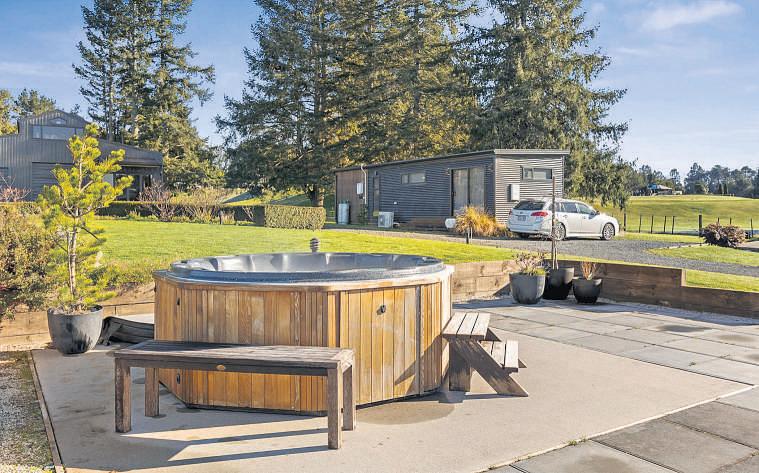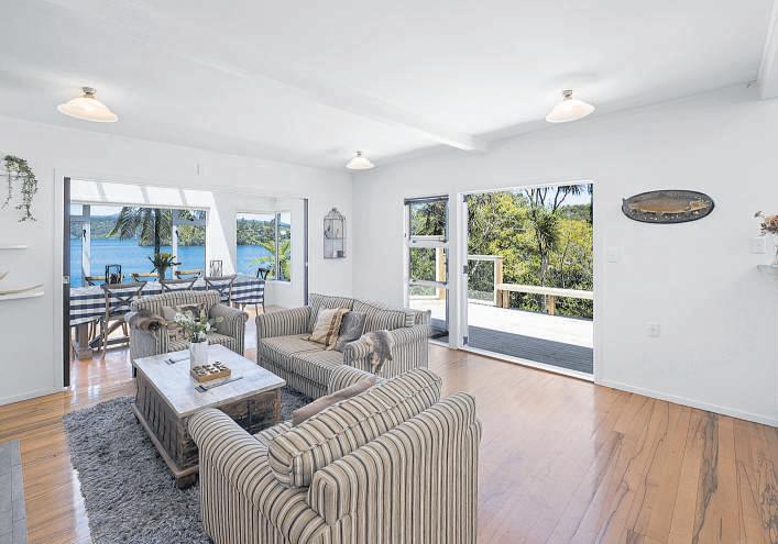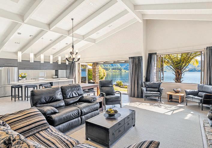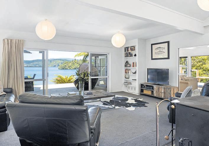 The four-bedroom bach spans two levels with open living a modern log burner floor-to-ceiling windows and French doors opening to a large deck overlooking the lake. A flat lawn leads to the water’s edge, complete with jetty, slipway boat garage and storage