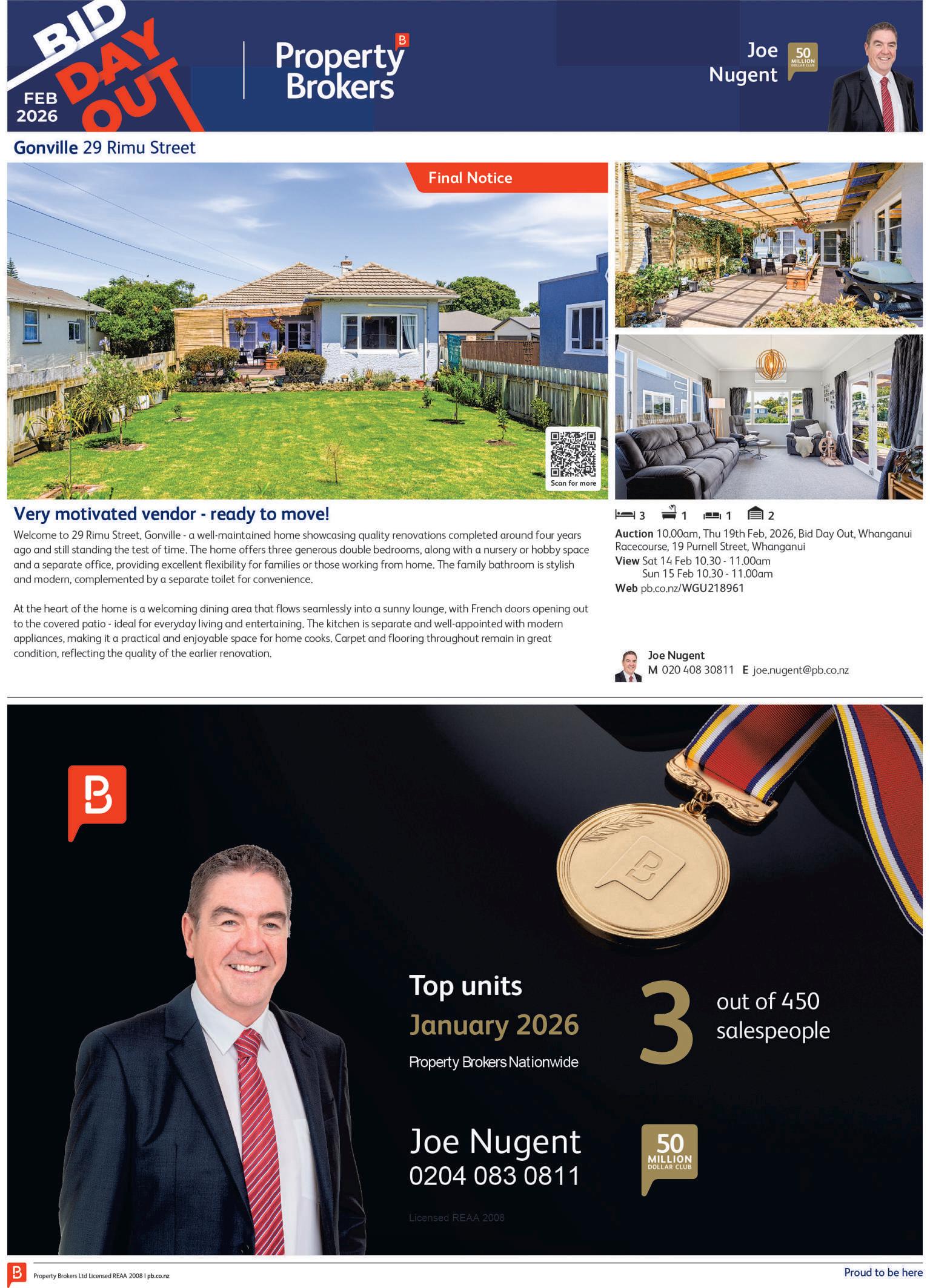 Auction 10.00am,Thu19thFeb,2026,BidDayOut, WhanganuiRacecourse,19PurnellStreet,Whanganui View Sun15Feb12.30-1.00pm Web pb.co.nz/WGU219874