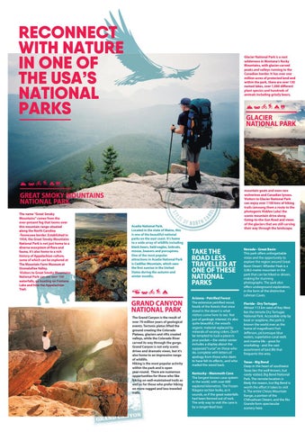 TAKE THE ROAD LESS TRAVELLED AT ONE OF THESE NATIONAL PARKS Arizona - Petrified Forest The extensive petrified wood, fossils of the forests that once stood in the desert is what visitors come here to see. Not just of geologic interest; it’s also quite beautiful, the wood’s organic material replaced by minerals of varying colors. Don’t be tempted to tuck a piece in your pocket – the visitor center includes a display about the supposed “curse” on those who do, complete with letters of apology from those who claim to have felt its effects...and who mailed the wood back. Kentucky - Mammoth Cave The longest known cave system in the world, with over 600 explored kilometres. The Frozen Niagara section looks, as it sounds, as if the great waterfalls had been formed out of rock. The only way to visit the cave is by a ranger-lead tour.