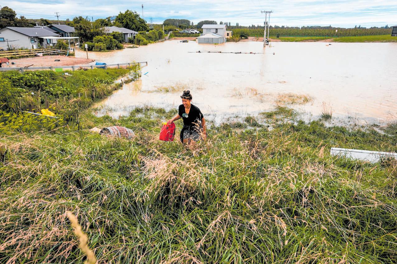 Awomansalvages afuelcontainerfromfloodwatersatWaiohikinearNapier.