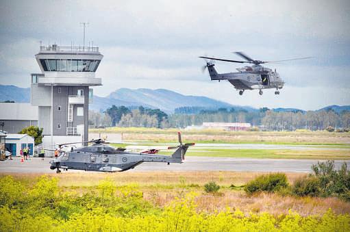 AirforcechopperstakeofffromHawke’sBayAirport.TheAirforce hasplayed fromrooftopsandfloodwaters.