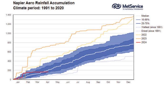 RainfallaccumulationatNapierAerodromein2024(red).Notethesharpcontrasttothewet yearsof2022(yellowdotted)and2023(orangedotted)aswellastheextendedrunofdry weatherfromearlyFebruarytoearlyApril.