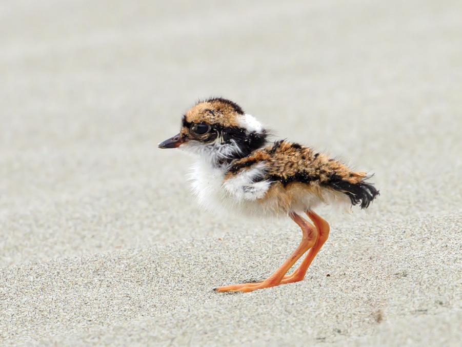 The black-fronted dotterel is a small, native wading bird identified by its black-tipped red bill, orange legs, and prominent black bands on the breast and face contrasting with the rest of the white and light-brown plumage. The juvenile birds have mostly white on their breast, with the black bands developing on maturity. There are estimated to be about three thousand birds scattered throughout New Zealand where they are most likely to be seen near waterways, lakes and coastal estuaries. We are lucky here on the Kāpiti Coast to have a regular nesting site for these diminutive and charming birds. The little river estuary at Peka Peka has been a favourite spot for the birds to nest for several years. Their nests are simple scrapings in the sand where they lay 2 or 3 olive-coloured eggs around November each year. Unfortunately, this area is a favourite place for dogs to be let off the lead, and for off-road vehicles to churn up the sand, making it a risky place to incubate the eggs and raise their young. Finding the nests is difficult, and observations must be made from discrete positions while wearing appropriate low-visibility clothing to not disturb the nesting birds. This summer I was lucky enough to be able to photograph the nesting birds and their chicks almost daily, so providing documentary records of their progress from eggs to flight. The newborn chicks are about the size of a large bumblebee on stilt-like legs. They are active almost from day one, and are soon feeding themselves on sand insects. I’m delighted to say that, this summer, both chicks survived and fledged.