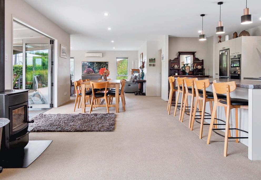 Open-plan family living includes bespoke kitchen, dining, family lounge with wood burner. Separate lounge with open fire. Outdoor flow from dining and family lounge to sheltered patio, out to playground lawns and gardens Separate laundry, internal double garage, ample off-street parking