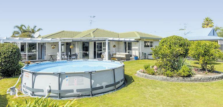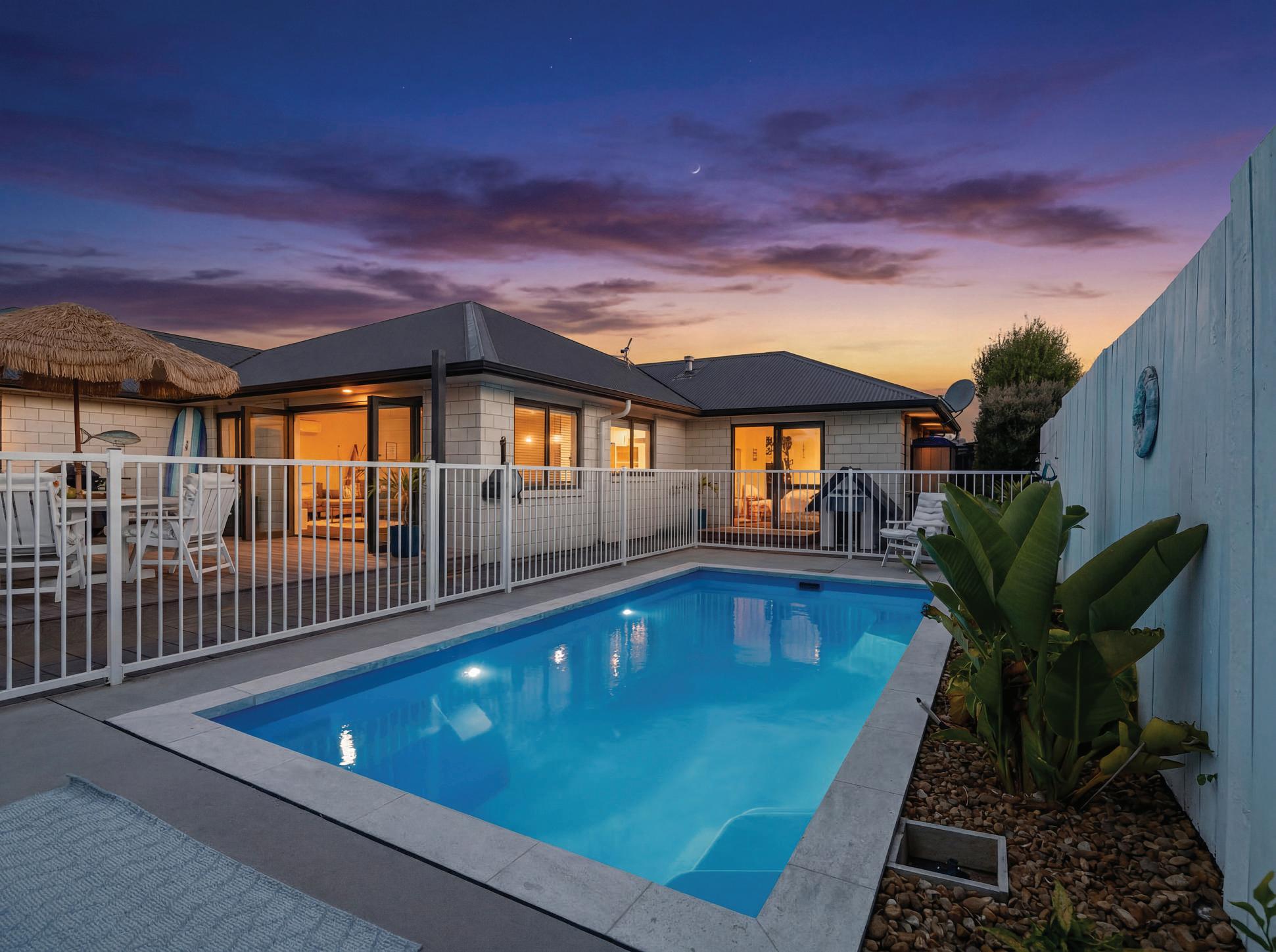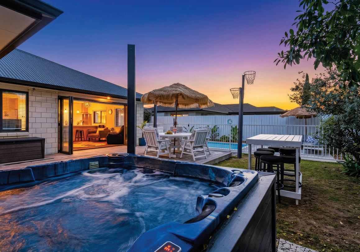 24RaihaSt,PapamoaEast 610sqm(approx),fencedsectionwithswimming poolandspapool.226sqm(approx)GoldenHomes build,brickconstruction.Fourbedrooms,two bathrooms,powderroom.Open-planfamilyliving includeskitchenwithbar-stoolsetting,diningand loungewithheatpump.Separatelounge.Outdoor flowfrombothlivingareasandmasterbedroomto sundeck,swimmingpoolandspapool.Separate laundry.Carpetedinternalaccessdoublegarage. Off-streetparking.Walktoschools,daycare, playgroundsandWairakeiwaterwaytrails.Near ExcelsaVillagewithconveniencestores,cinema, eateriesandmedicalfacilities.Shortdrivetothe Sands,withsupermarket,eateriesandmoreto come.NearthebeachandEasternLinkaccess.