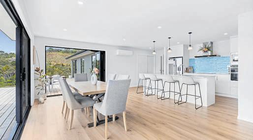 Completed in 2025 and within a gated estate just minutes from town this architectural residence is pure intent Sheltered, private, and elevated above the harbour, it captures sweeping views to the Hen and Chicks Islands while remaining completely removed from the world below The living zone quite literally floats over the landscape - a dramatic lounge projecting into the canopy creating the sensation of living in the treetops Four bedrooms are well separated, including a refined master retreat The kitchen is substantial and streamlined, anchored by engineered surfaces and integrated appliances Solid oak floors run throughout the living spaces adding warmth and weight to the clean architectural lines