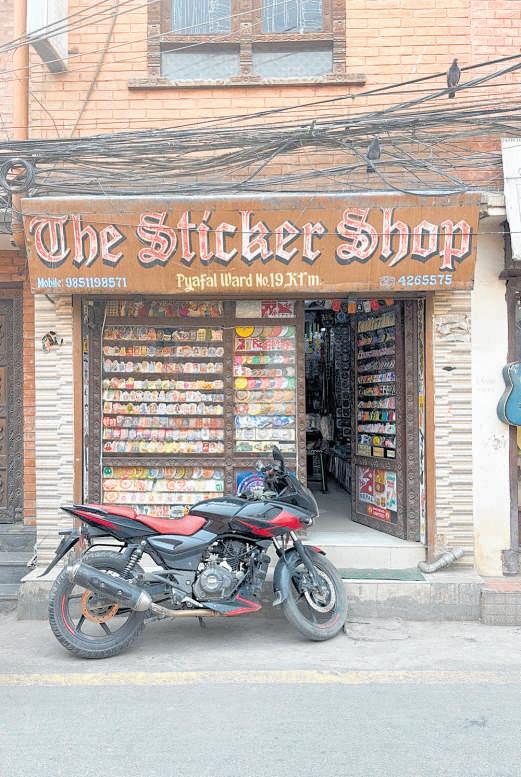 2pm:StickerShoponYatkhaRd LeaveDurbarSquareandheadto YatkhaRdwhereyou’llfindabrilliant stickershop.Thearrayisdizzying, spanningmotorsportandcultural iconography,flagsandregionalsymbols andtherequisiteNepalregalia.Itall makessensewhenyouseethemotorbikes, scootersandtrucksofthecity.Ispentages inthestore,withsomuchtochoosefrom,and leftwithanassortmentofstickersforfriendsand familybackhome(andforme).